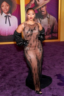Chloë Bailey supported her sister at the Colour Purple Movie Premiere wearing a pair of the Handsome Stockholm x B. Åkerlund Duchess Gloves in black.
