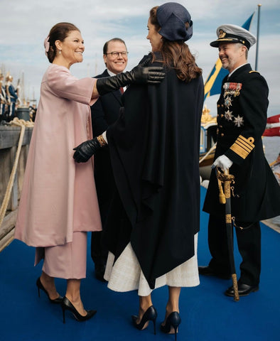 Crown Princess Victoria of Sweden wearing Essentials Long Black gloves by Handsome Stockholm during a state visit by the King and Queen of Denmark.